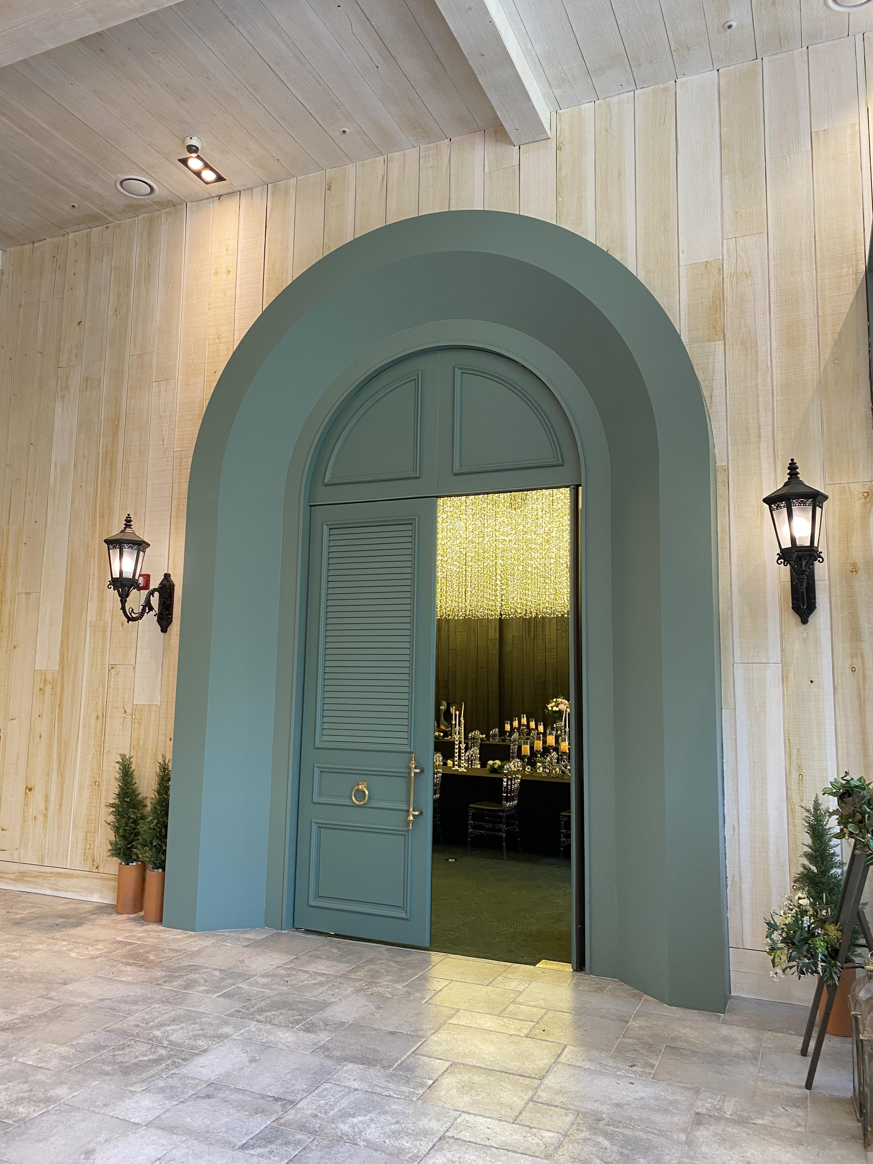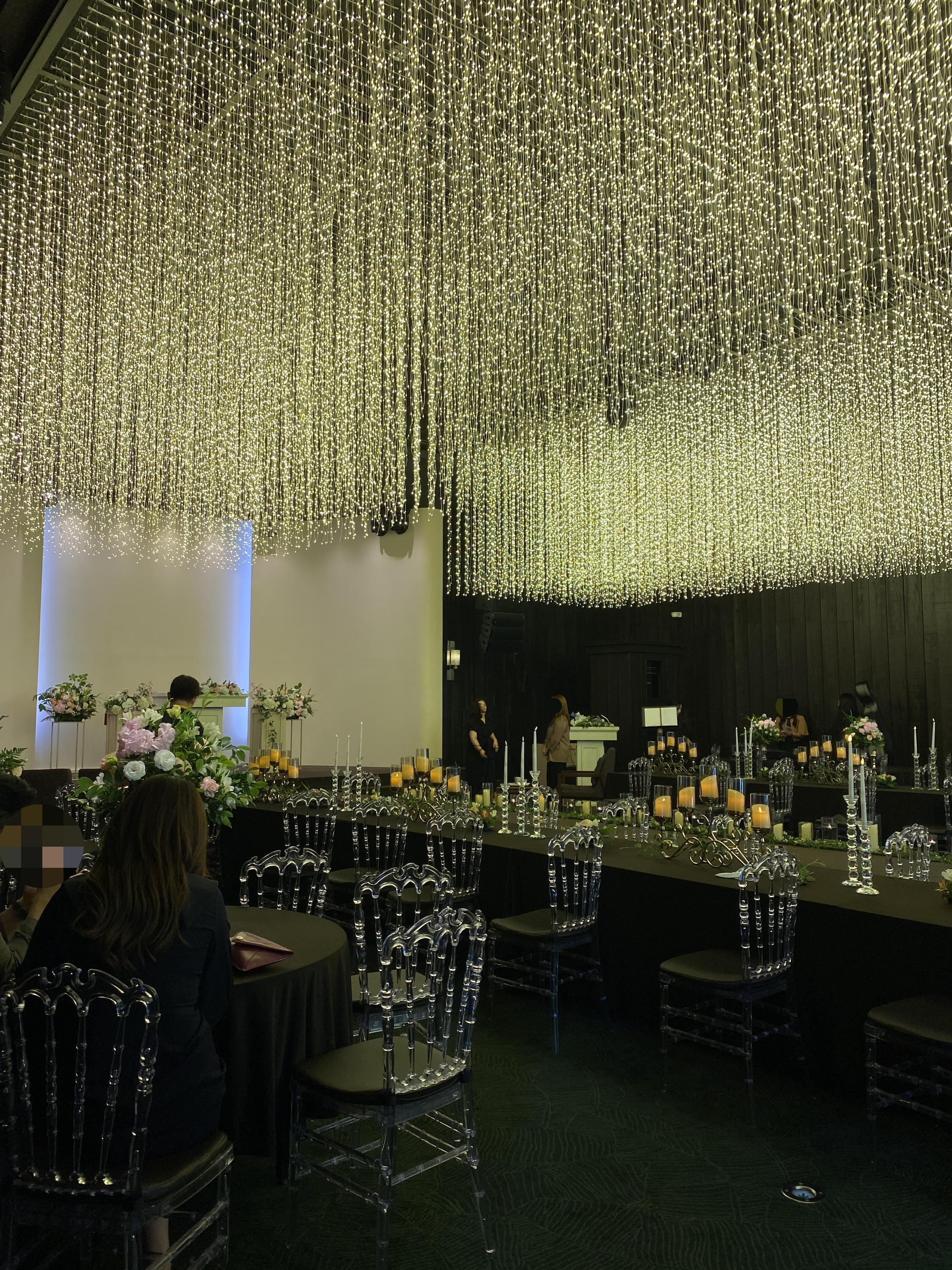 힐시크릿 홀로 들어가는 입구 문의 모습입니다. 모든 하객은 이 문을 통해 드나듭니다. 문 양쪽의 가로등 디자인의 조명들까지 분위기를 더합니다. 밖에서 보았을 때 눈에 들어오는 내부 홀의 모습이 멀리서 보아도 감탄을 자아냈습니다. 끝이 보이지 않는 천장에서 내려오는 은하수 디자인의 샹들리에가 매우 매우 아름답습니다. 샹들리에가 풍기는 분위기가 정말 압도적이었습니다.