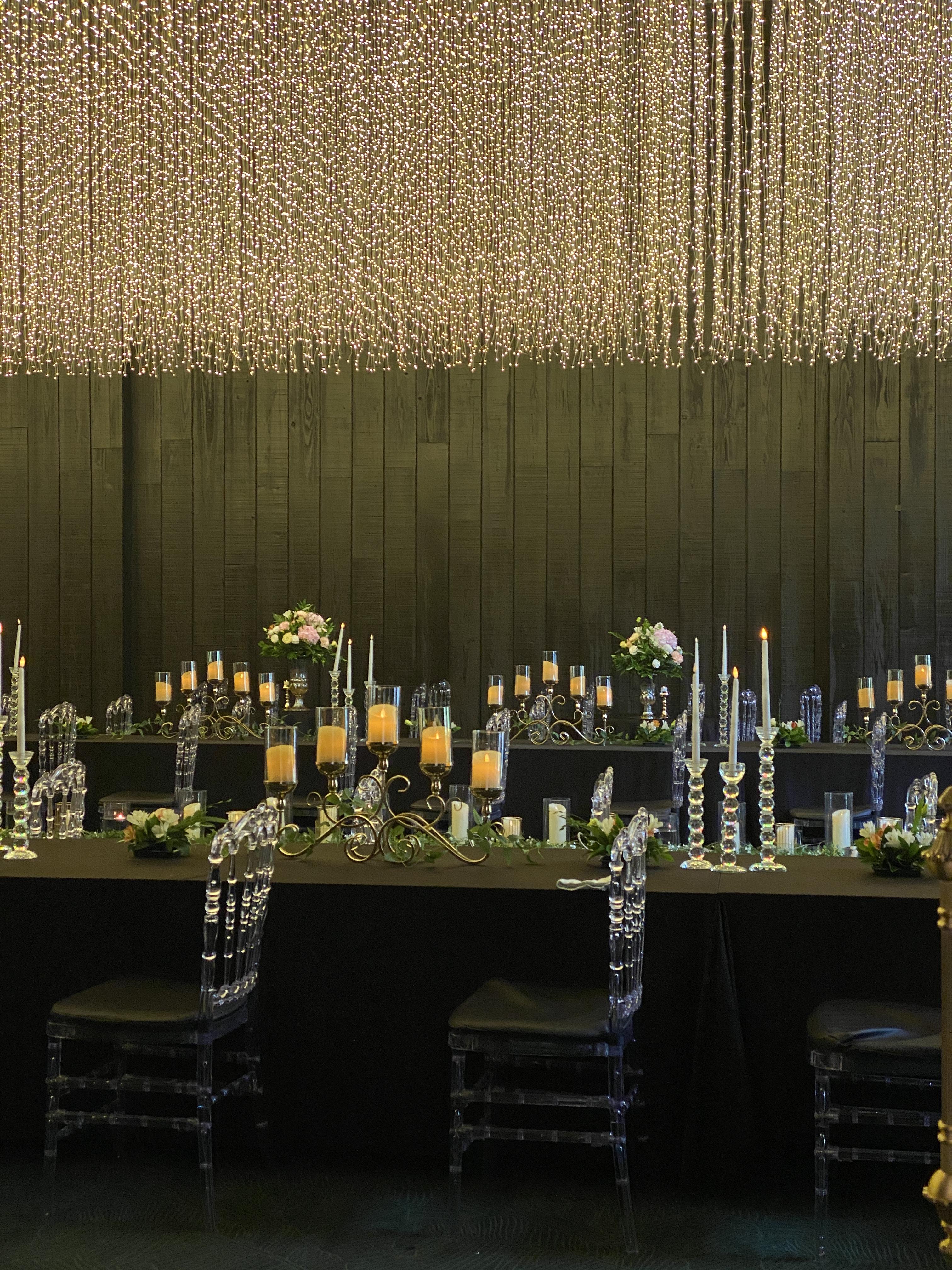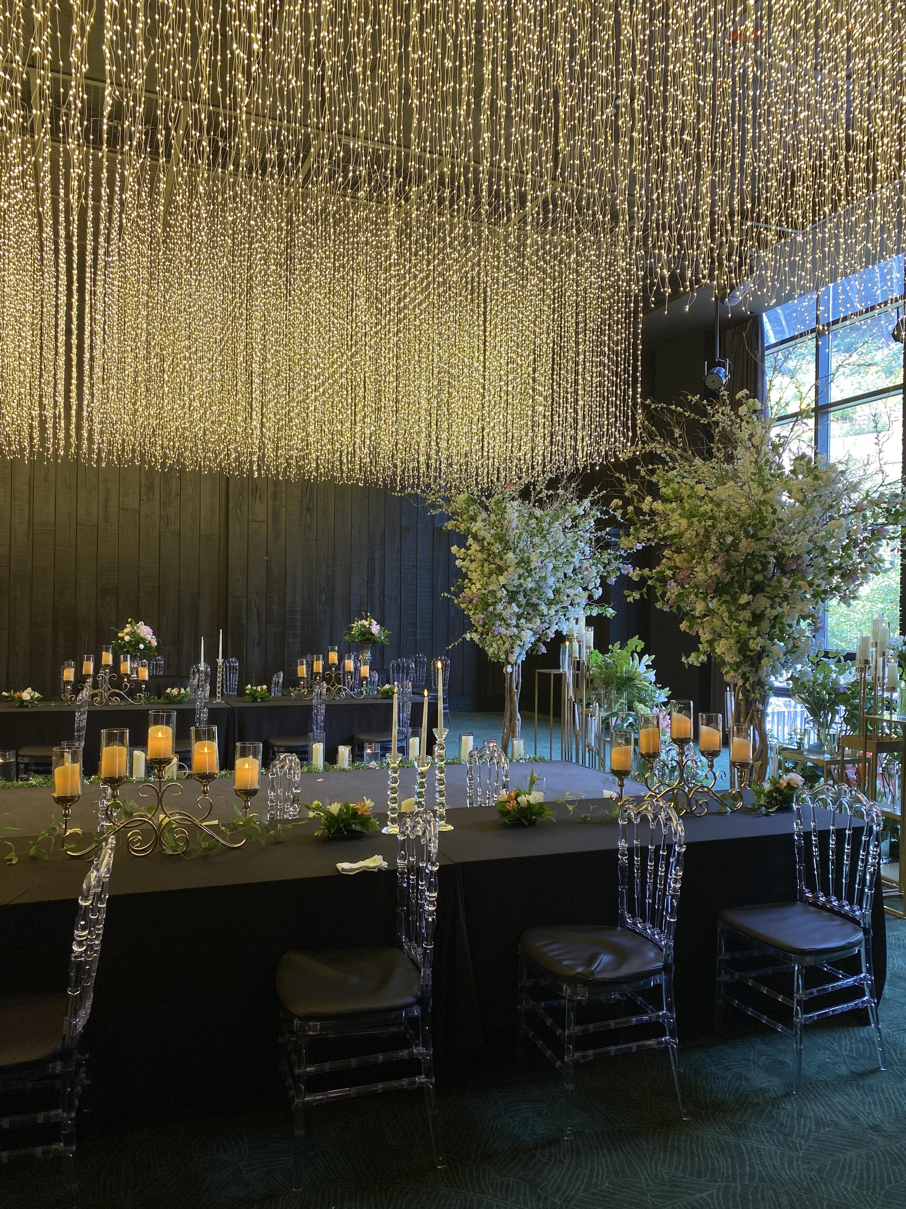 검은색 테이블들 위로는 초들이 분위기를 더해주었고 촛대와 의자의 등받이를 크리스털 디자인으로 맞춰져 있어 고급스러움을 더해주었습니다.