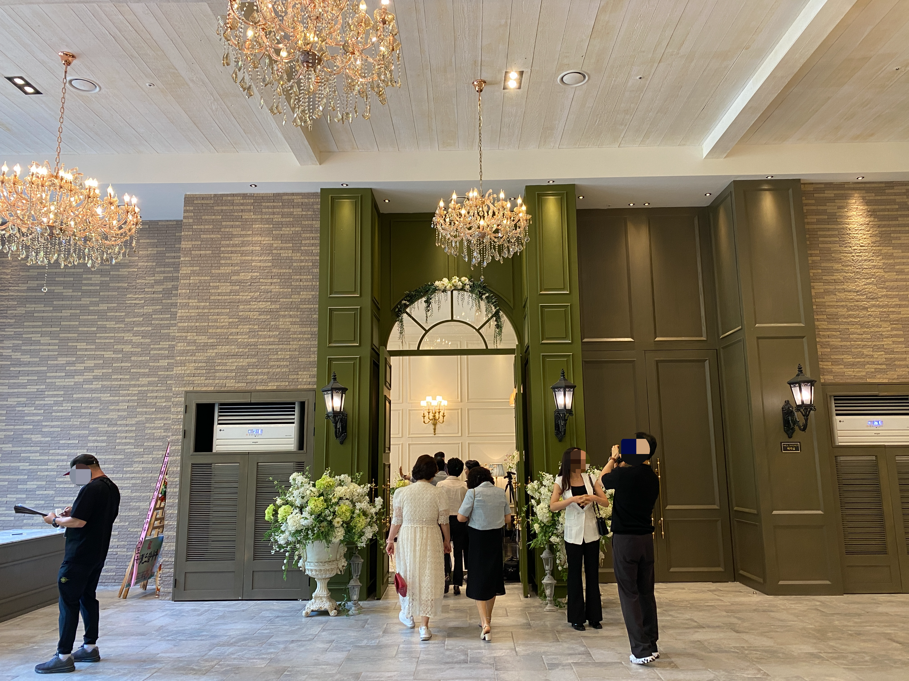 신부대기실로 들어서는 입구의 모습입니다. 딱 보아도 성인 키의 3배 정도에 달하는 높이로 층고가 매우 높습니다. 덕분에 탁 트인 공간으로 하여금 웨딩홀의 웅장함을 보여줍니다. 원래는 나무로 인테리어가 되어 있던 걸로 아는데 내부에도 벽돌을 사용하여 구성해 놓으니 야외에 온 느낌이 들기도 하고 바깥 풍경과 더욱더 잘 어우러지는 거 같습니다. 간간이 보이는 가로등 느낌의 조명들까지 말입니다.